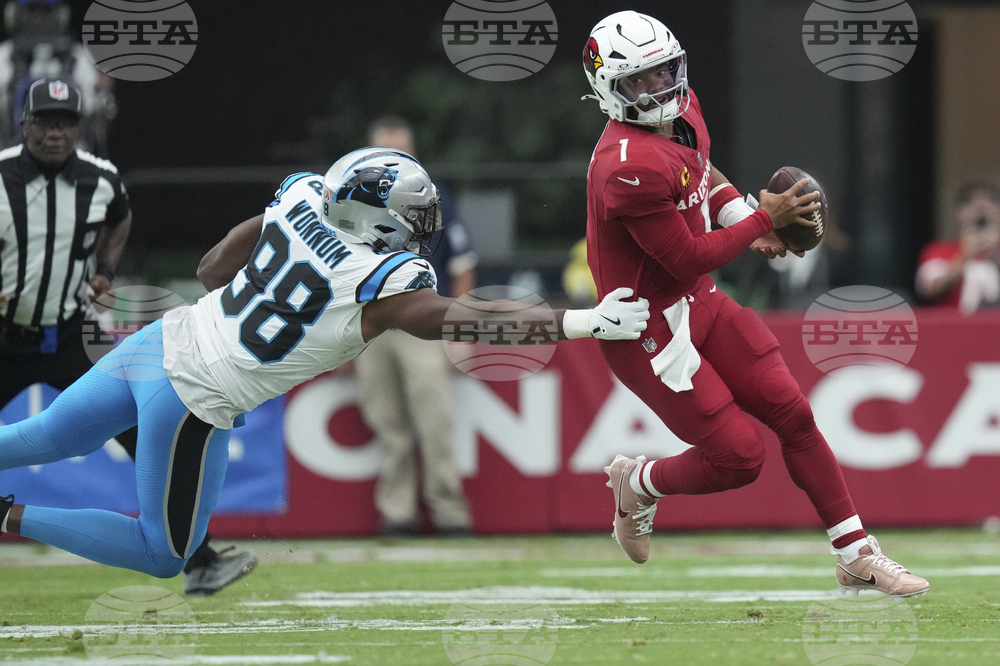 Arizona Cardinals quarterback Kyler Murray (1) eludes the reach of Carolina Panthers linebacker D.J. Wonnum (98) during the first half of an NFL football game, Sunday, Sept. 14, 2025, in Glendale, Ariz. (AP Photo/Ross D. Franklin)