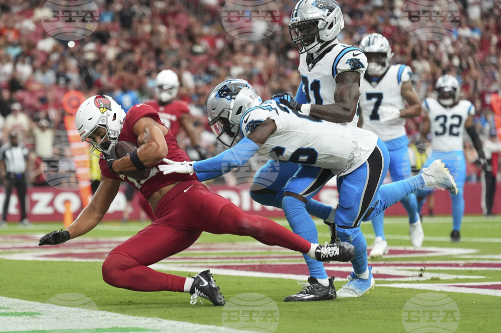 Arizona Cardinals wide receiver Michael Wilson scores a touchdown as Carolina Panthers cornerback Chau Smith-Wade, right, defends during the first half of an NFL football game, Sunday, Sept. 14, 2025, in Glendale, Ariz. (AP Photo/Ross D. Franklin)