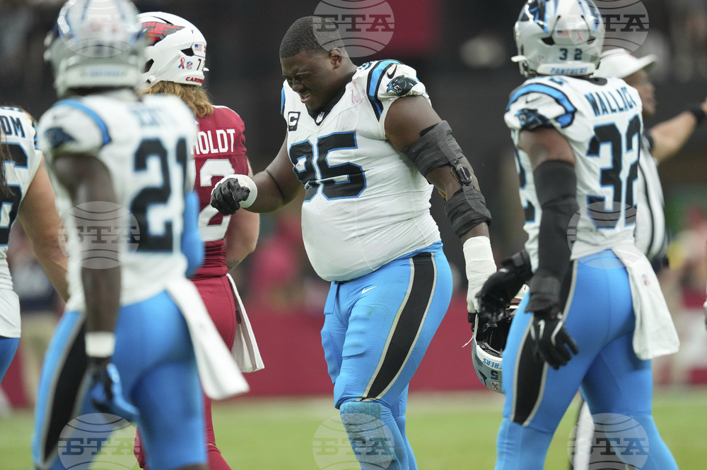 Carolina Panthers defensive end Derrick Brown grimaces after a play against the Arizona Cardinals during the first half of an NFL football game, Sunday, Sept. 14, 2025, in Glendale, Ariz. (AP Photo/Ross D. Franklin)