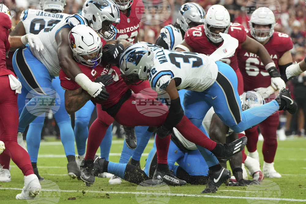 Arizona Cardinals running back James Conner (6) scores a touchdown as Carolina Panthers linebacker Trevin Wallace (32) defends during the second half of an NFL football game, Sunday, Sept. 14, 2025, in Glendale, Ariz. (AP Photo/Ross D. Franklin)