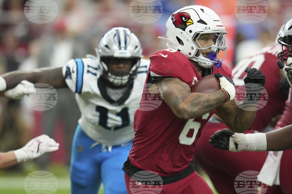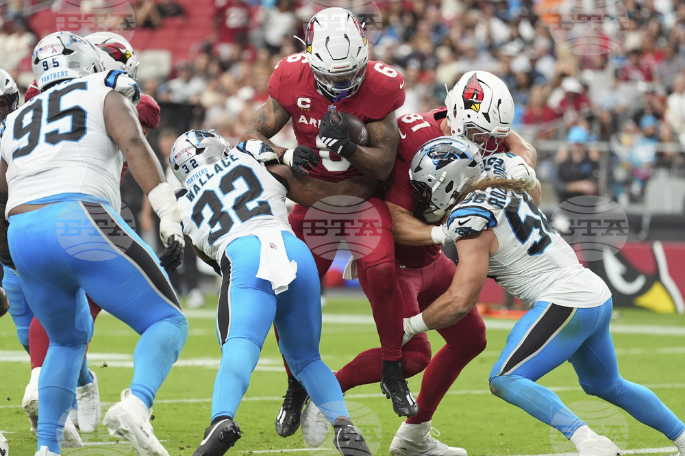 Arizona Cardinals running back James Conner (6) runs against the Carolina Panthers during the second half of an NFL football game, Sunday, Sept. 14, 2025, in Glendale, Ariz. (AP Photo/Rick Scuteri)