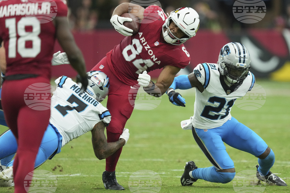 Arizona Cardinals tight end Trey McBride (85) is hit by Carolina Panthers cornerback Mike Jackson during the first half of an NFL football game, Sunday, Sept. 14, 2025, in Glendale, Ariz. (AP Photo/Ross D. Franklin)