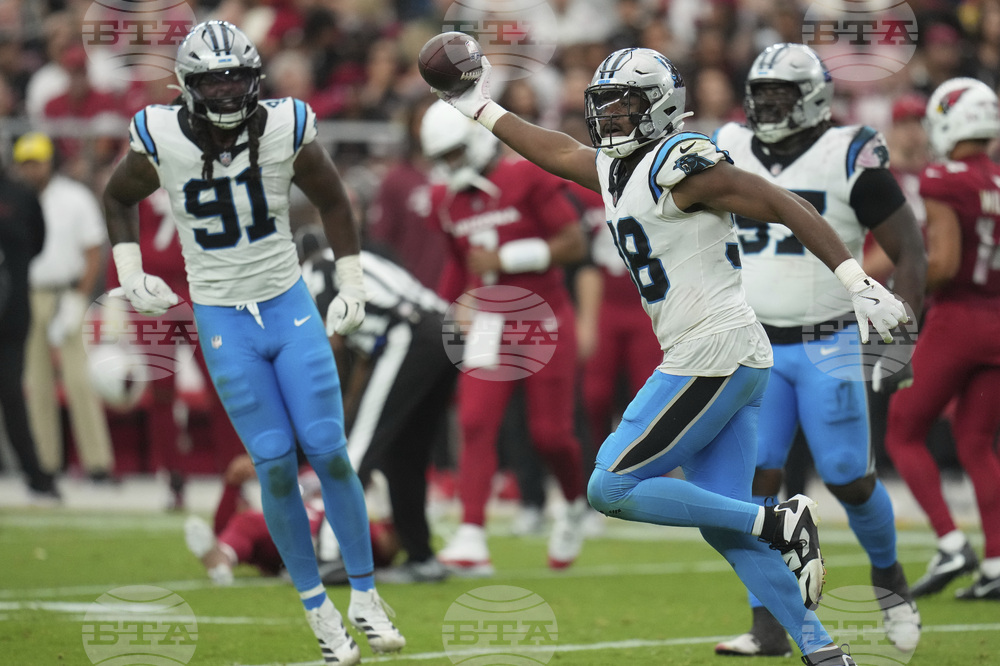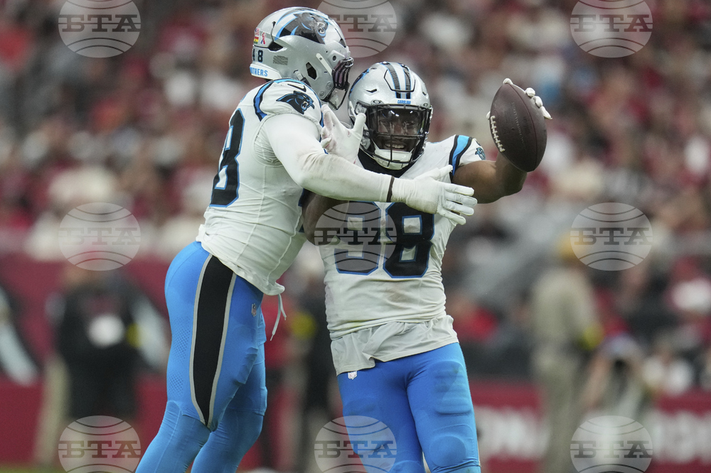 Carolina Panthers linebacker D.J. Wonnum (98) celebrates an interception against the Arizona Cardinals during the second half of an NFL football game, Sunday, Sept. 14, 2025, in Glendale, Ariz. (AP Photo/Rick Scuteri)