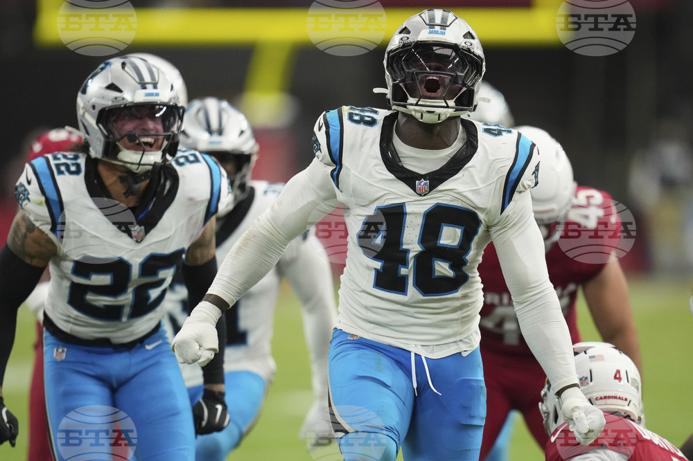 Carolina Panthers linebacker Thomas Incoom (48) celebrates a defensive stop against the Arizona Cardinals during the second half of an NFL football game, Sunday, Sept. 14, 2025, in Glendale, Ariz. (AP Photo/Rick Scuteri)
