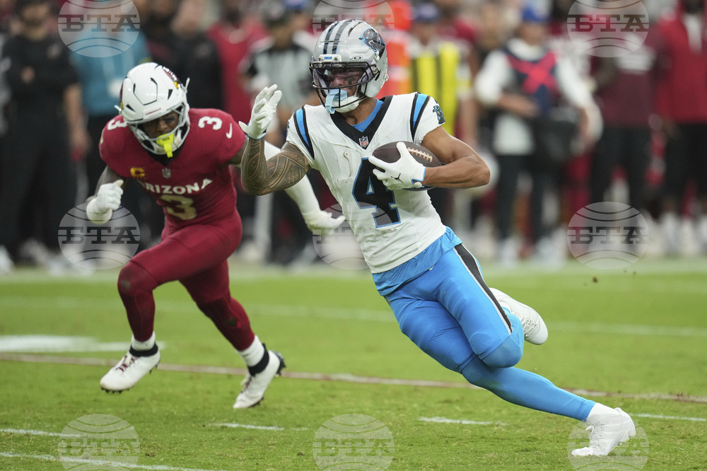 Carolina Panthers wide receiver Tetairoa McMillan (4) runs as Arizona Cardinals safety Budda Baker (3) pursues during the second half of an NFL football game, Sunday, Sept. 14, 2025, in Glendale, Ariz. (AP Photo/Rick Scuteri)