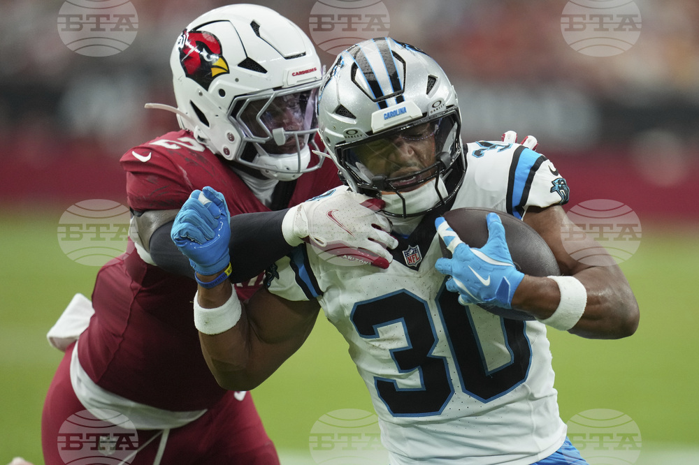 Carolina Panthers running back Trevor Etienne is tackled by Arizona Cardinals safety Kitan Crawford (36) during the first half of an NFL football game, Sunday, Sept. 14, 2025, in Glendale, Ariz. (AP Photo/Ross D. Franklin)