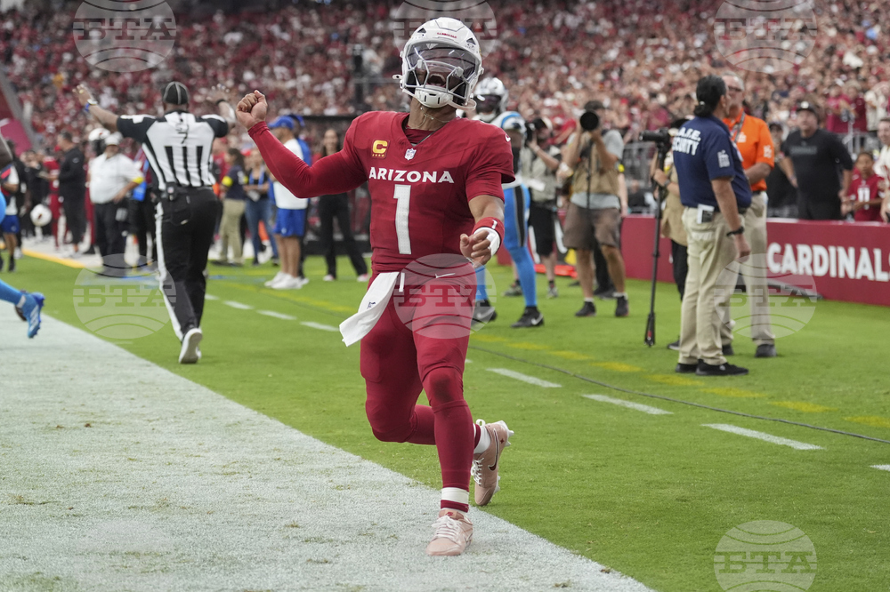 Arizona Cardinals quarterback Kyler Murray (1) celebrates during the second half of an NFL football game against the Carolina Panthers, Sunday, Sept. 14, 2025, in Glendale, Ariz. (AP Photo/Ross D. Franklin)