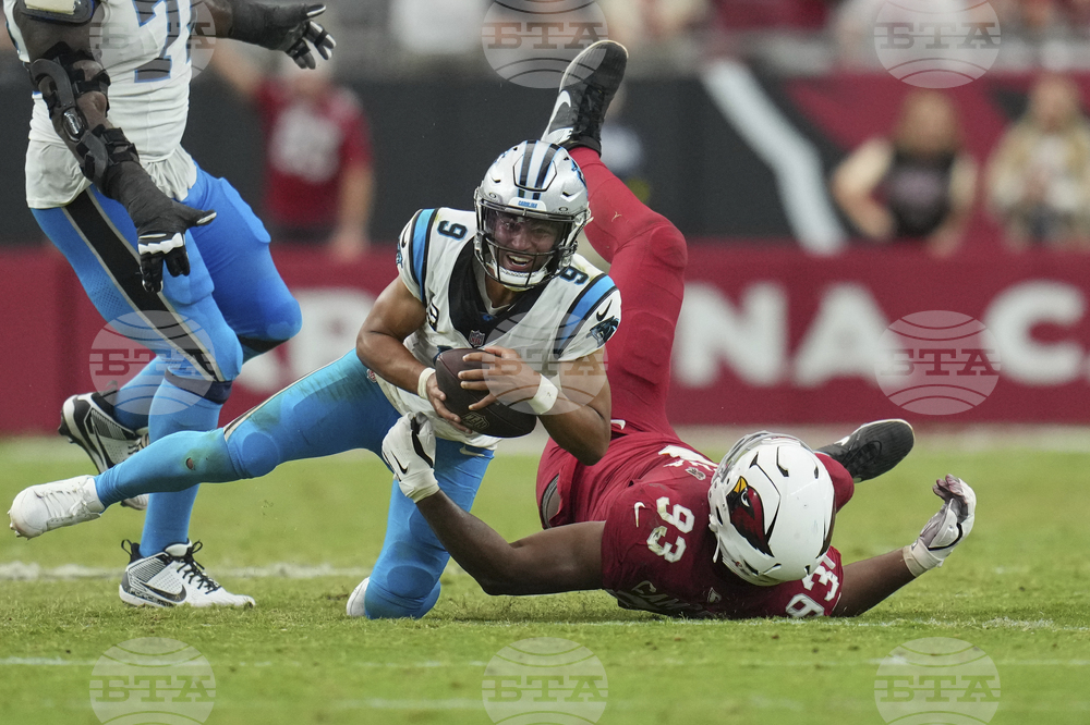 Carolina Panthers quarterback Bryce Young (9) is tackled by Arizona Cardinals defensive tackle Calais Campbell (93) during the second half of an NFL football game, Sunday, Sept. 14, 2025, in Glendale, Ariz. (AP Photo/Rick Scuteri)