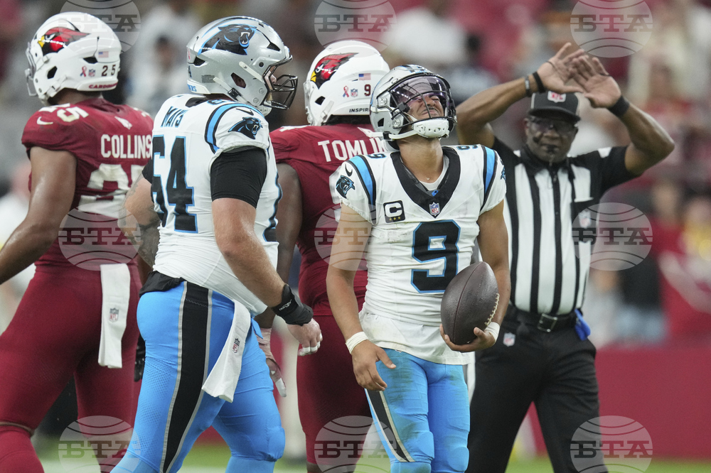 Carolina Panthers quarterback Bryce Young (9) reacts during the second half of an NFL football game against the Arizona Cardinals, Sunday, Sept. 14, 2025, in Glendale, Ariz. (AP Photo/Ross D. Franklin)