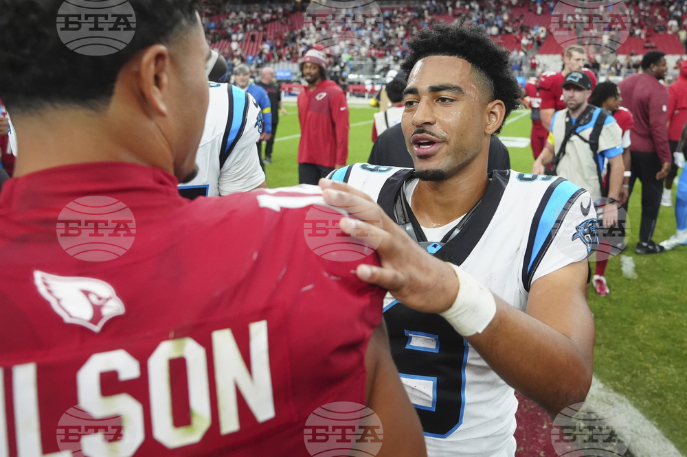 Carolina Panthers quarterback Bryce Young (9) greets Arizona Cardinals wide receiver Michael Wilson after an NFL football game, Sunday, Sept. 14, 2025, in Glendale, Ariz. (AP Photo/Ross D. Franklin)