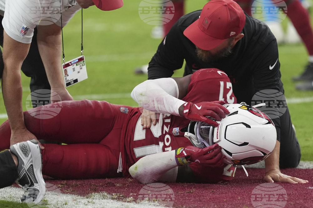 Arizona Cardinals cornerback Garrett Williams (21) is attended to by trainers after an injury against the Carolina Panthers during the second half of an NFL football game, Sunday, Sept. 14, 2025, in Glendale, Ariz. (AP Photo/Ross D. Franklin)