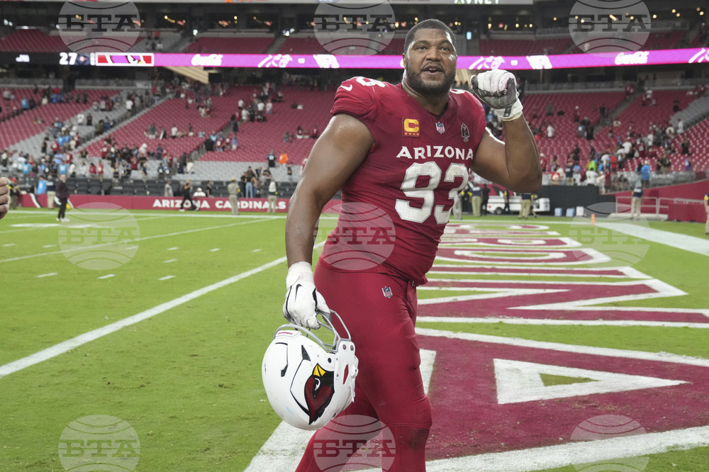 Arizona Cardinals defensive tackle Calais Campbell (93) leaves the field after an NFL football game against the Carolina Panthers, Sunday, Sept. 14, 2025, in Glendale, Ariz. (AP Photo/Rick Scuteri)