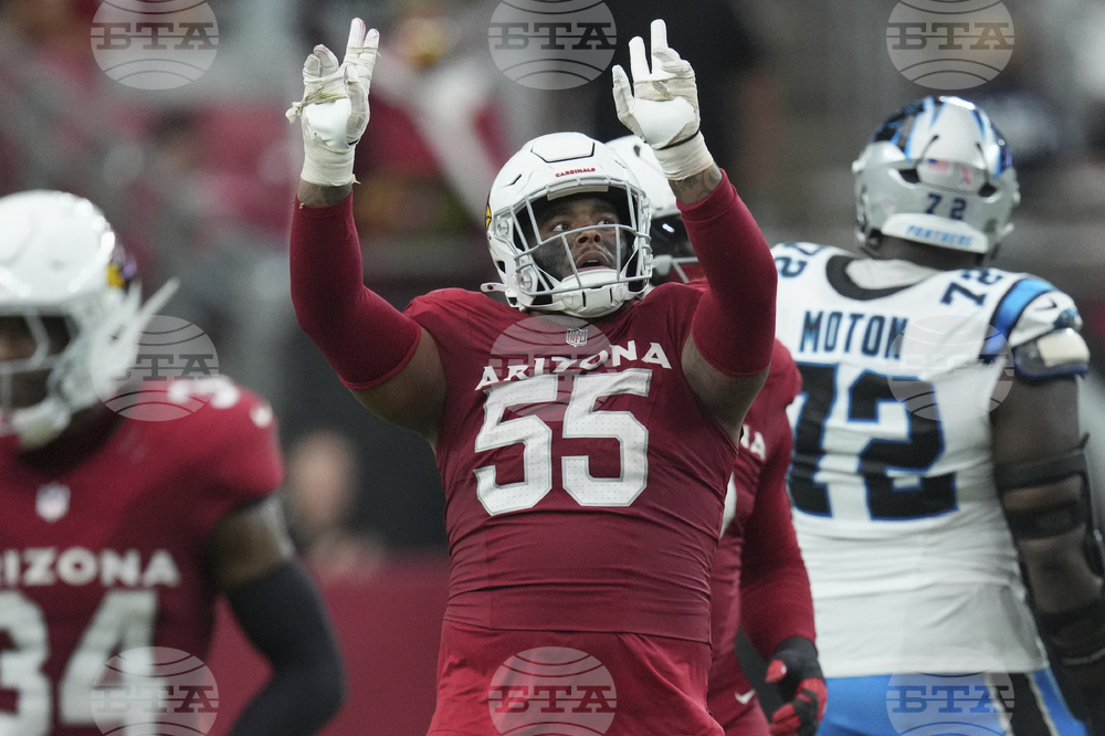 Arizona Cardinals defensive tackle Dante Stills (55) celebrates a stop against the Carolina Panthers during the second half of an NFL football game, Sunday, Sept. 14, 2025, in Glendale, Ariz. (AP Photo/Ross D. Franklin)