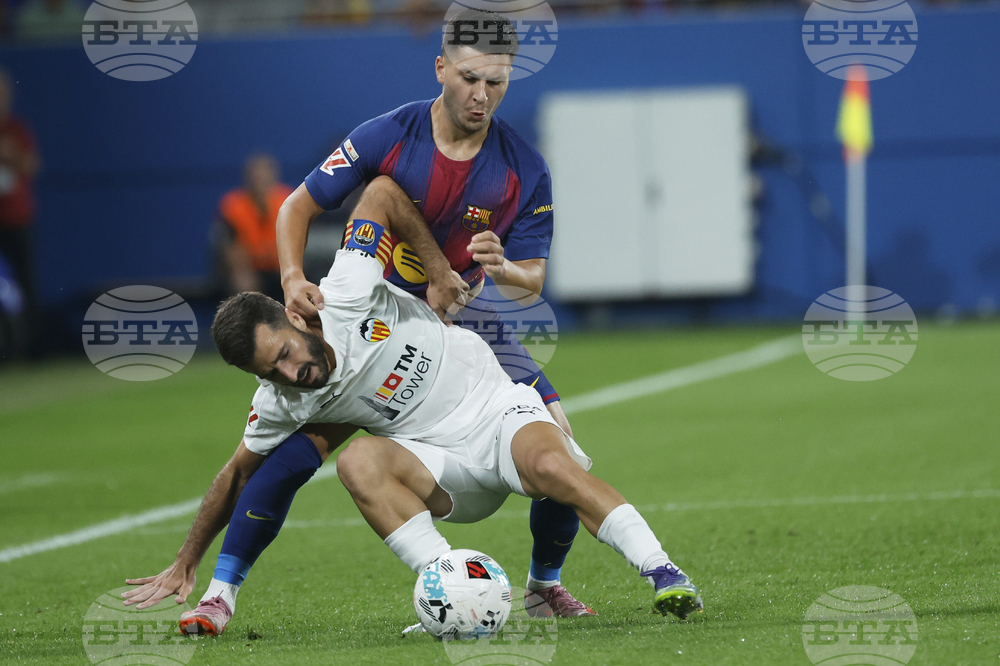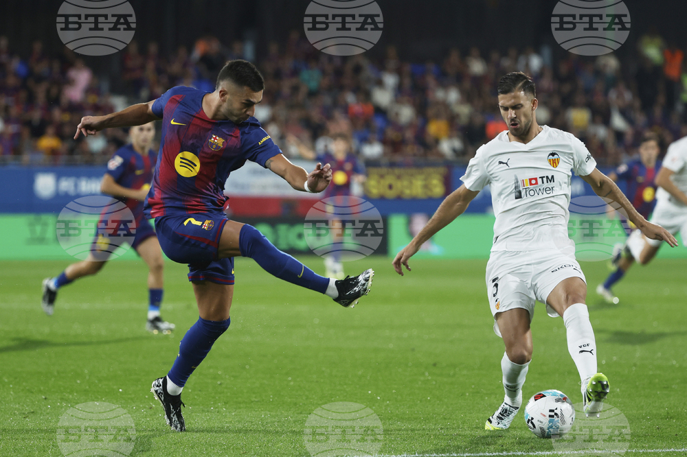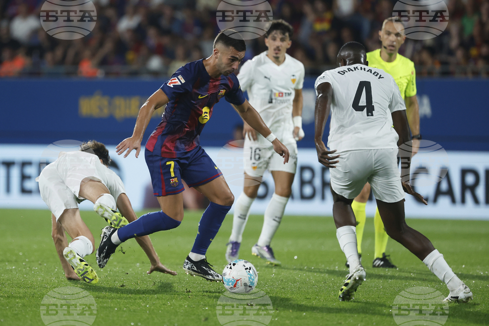 Barcelona's Fermin Lopez, left, and Valencia's Arnaut Danjuma vie for the ball during a Spanish La Liga soccer match between FC Barcelona and Valencia at the Johan Cruyff stadium in Barcelona, Spain, Sunday, Sept. 14, 2025. (AP Photo/Joan Monfort)