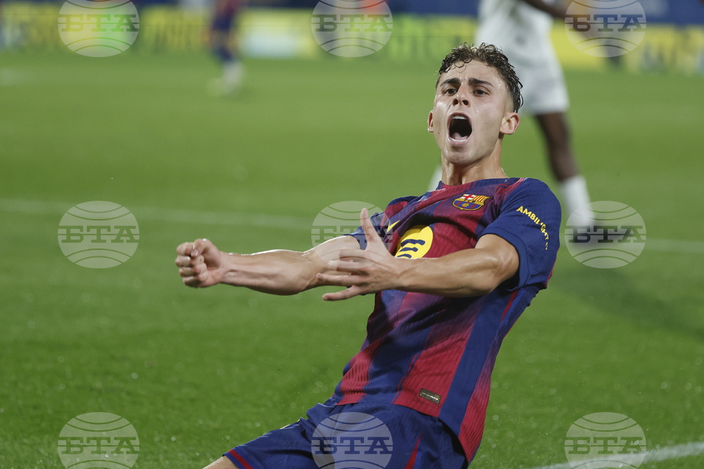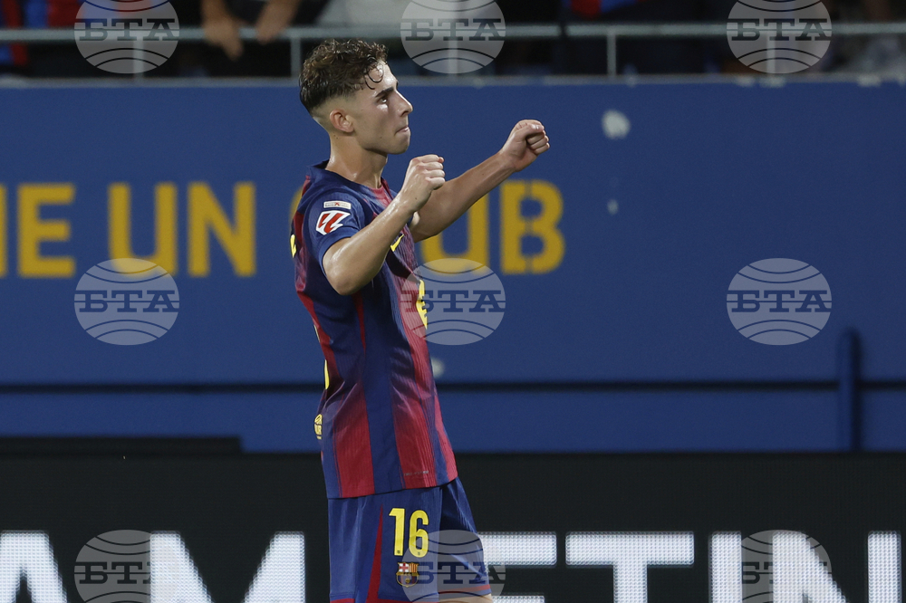Barcelona's Fermin Lopez celebrates scoring his side's opening goal during a Spanish La Liga soccer match between FC Barcelona and Valencia at the Johan Cruyff stadium in Barcelona, Spain, Sunday, Sept. 14, 2025. (AP Photo/Joan Monfort)