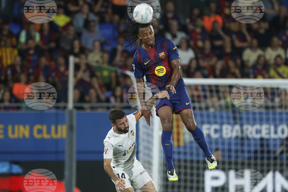 Barcelona's Jules Kounde, top, heads the ball past Valencia's Jose Gaya during a Spanish La Liga soccer match between FC Barcelona and Valencia at the Johan Cruyff stadium in Barcelona, Spain, Sunday, Sept. 14, 2025. (AP Photo/Joan Monfort)