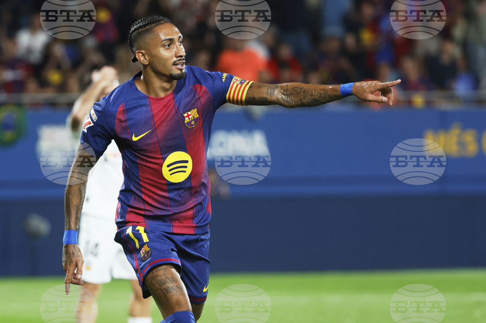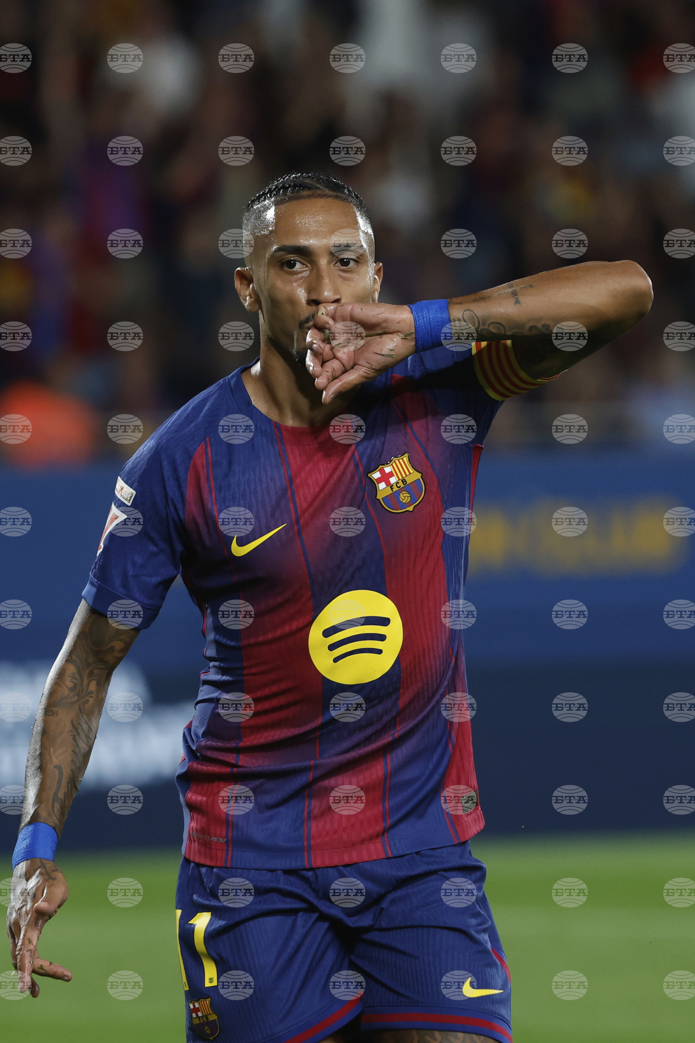 Barcelona's Raphinha celebrates scoring his side's 4th goal during a Spanish La Liga soccer match between FC Barcelona and Valencia at the Johan Cruyff stadium in Barcelona, Spain, Sunday, Sept. 14, 2025. (AP Photo/Joan Monfort)