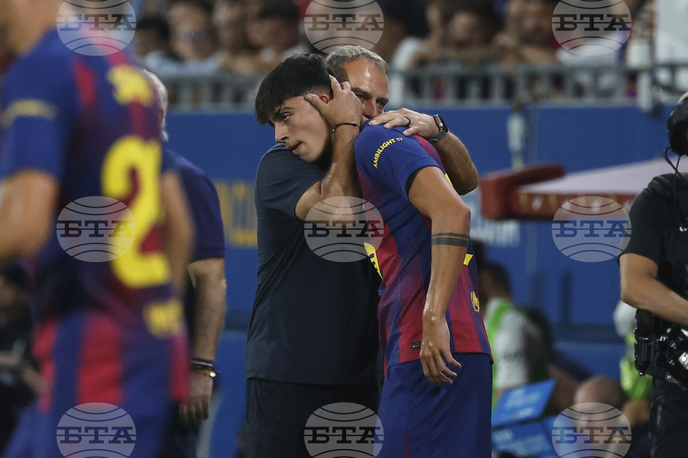 Barcelona's Pedri, left, greets Marc Bernal after being substituted during a Spanish La Liga soccer match between FC Barcelona and Valencia at the Johan Cruyff stadium in Barcelona, Spain, Sunday, Sept. 14, 2025. (AP Photo/Joan Monfort)