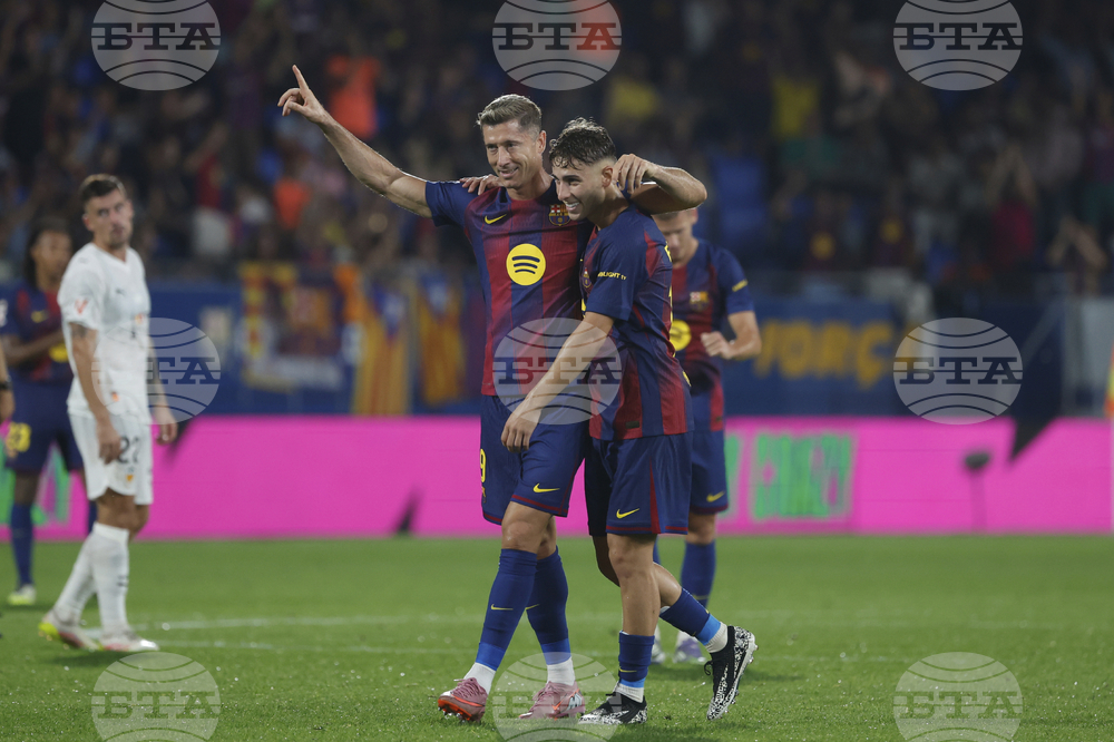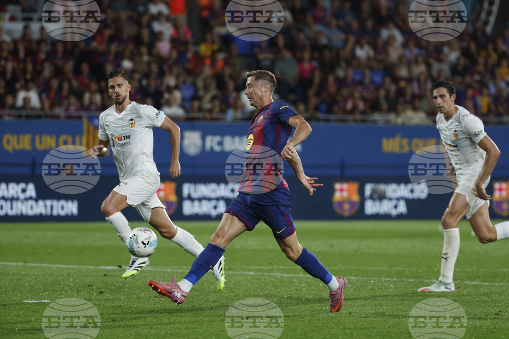 Barcelona's Robert Lewandowski, center, scores his side's 5th goal during a Spanish La Liga soccer match between FC Barcelona and Valencia at the Johan Cruyff stadium in Barcelona, Spain, Sunday, Sept. 14, 2025. (AP Photo/Joan Monfort)