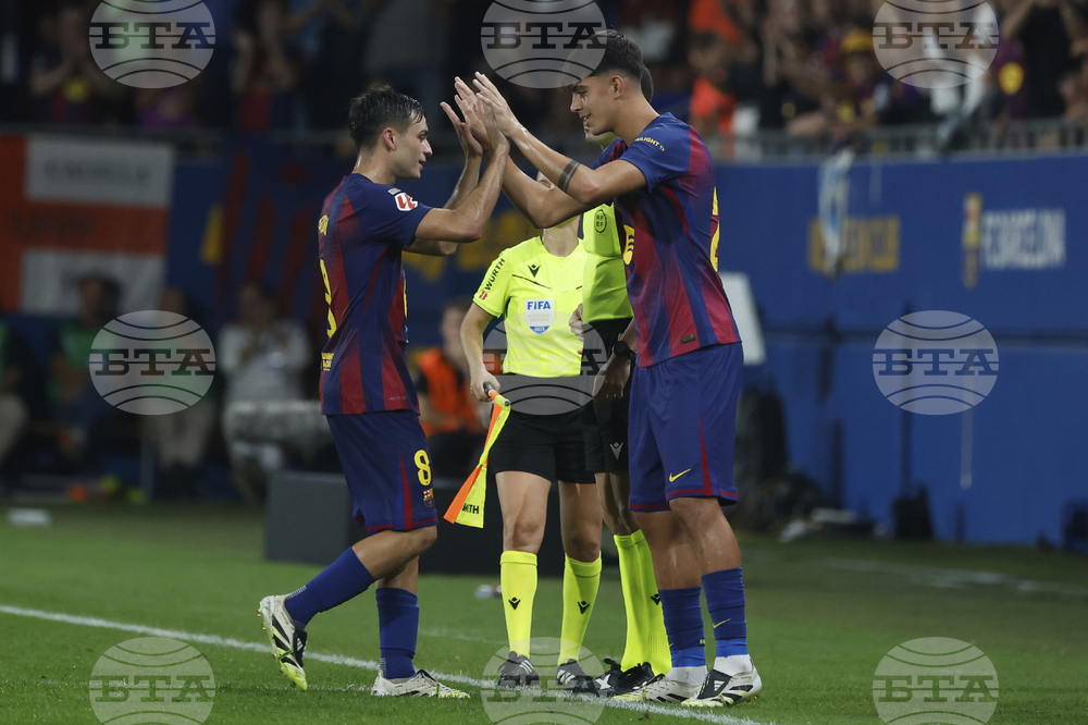 Barcelona's Fermin Lopez, front, celebrates scoring his side's 3rd goal with teammate Gerard Martin during a Spanish La Liga soccer match between FC Barcelona and Valencia at the Johan Cruyff stadium in Barcelona, Spain, Sunday, Sept. 14, 2025. (AP Photo/Joan Monfort)