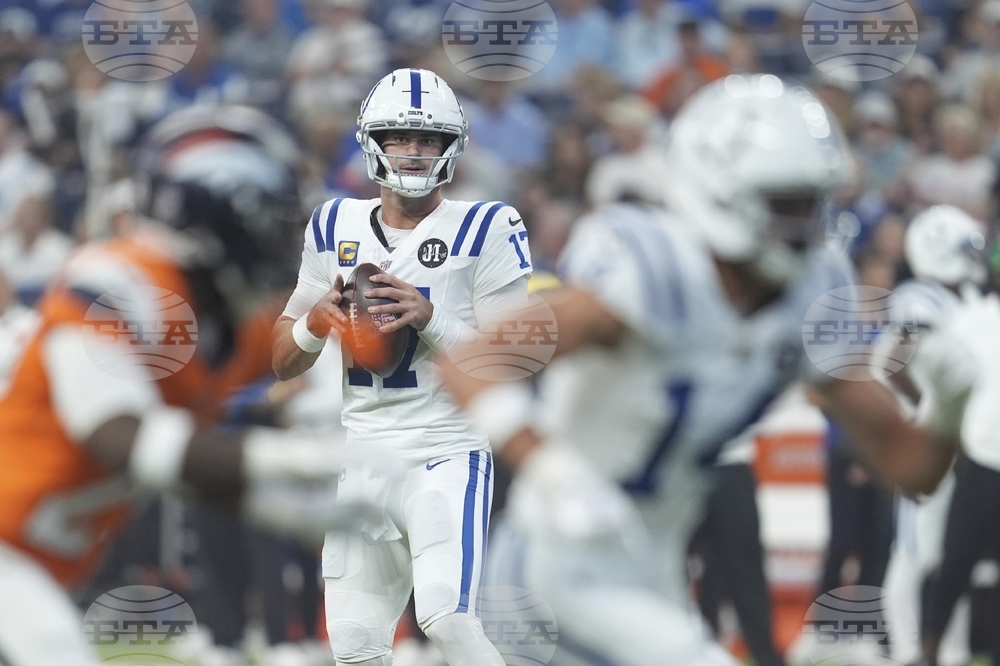 Indianapolis Colts quarterback Daniel Jones (17) looks to throw during the first half an NFL football game against the Denver Broncos, Sunday, Sept. 14, 2025, in Indianapolis. (AP Photo/Michael Conroy)