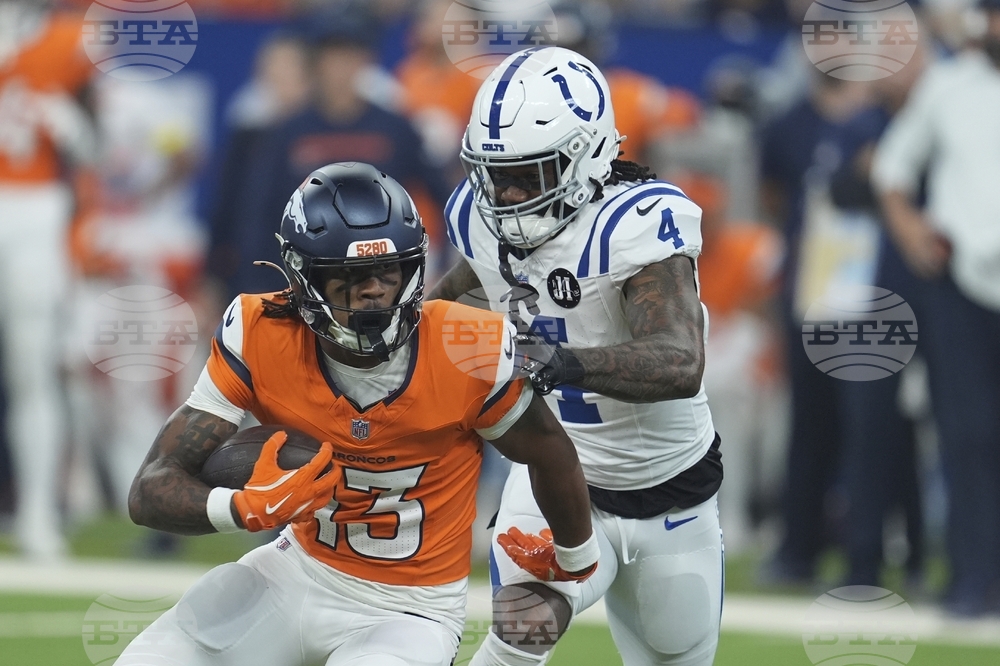 Denver Broncos wide receiver Pat Bryant (13) ruins against Indianapolis Colts cornerback Xavien Howard (4) during the first half an NFL football game, Sunday, Sept. 14, 2025, in Indianapolis. (AP Photo/Michael Conroy)