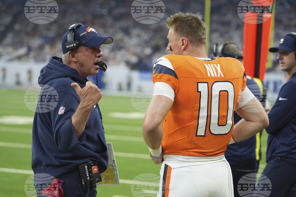 Denver Broncos head coach Sean Payton talks with quarterback Bo Nix during the first half an NFL football game against the Indianapolis Colts, Sunday, Sept. 14, 2025, in Indianapolis. (AP Photo/Michael Conroy)