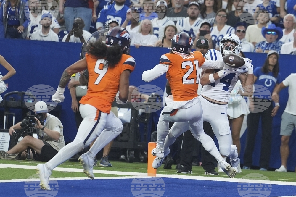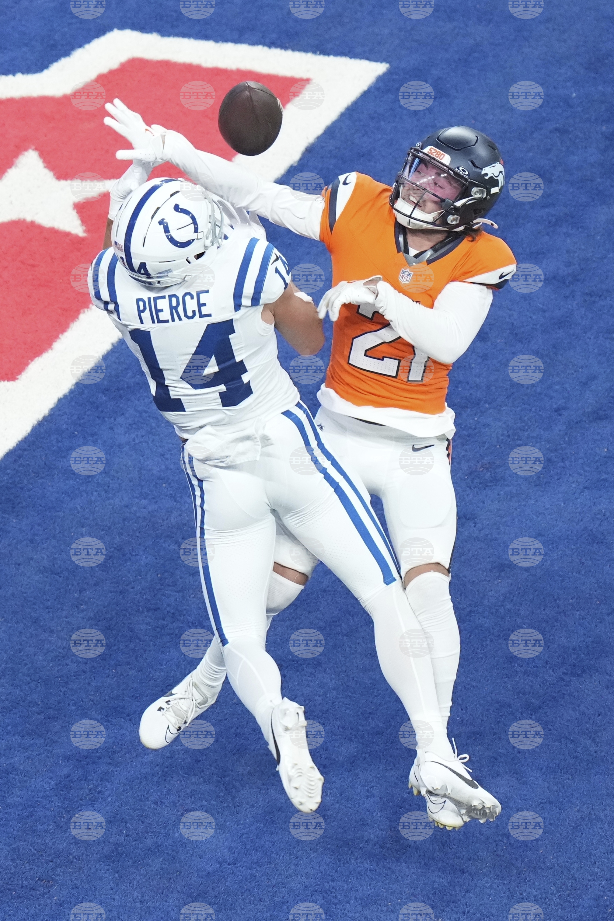 Denver Broncos cornerback Riley Moss (21) breaks up a pass intended by Indianapolis Colts wide receiver Alec Pierce (14) during the first half an NFL football game, Sunday, Sept. 14, 2025, in Indianapolis. (AP Photo/AJ Mast)