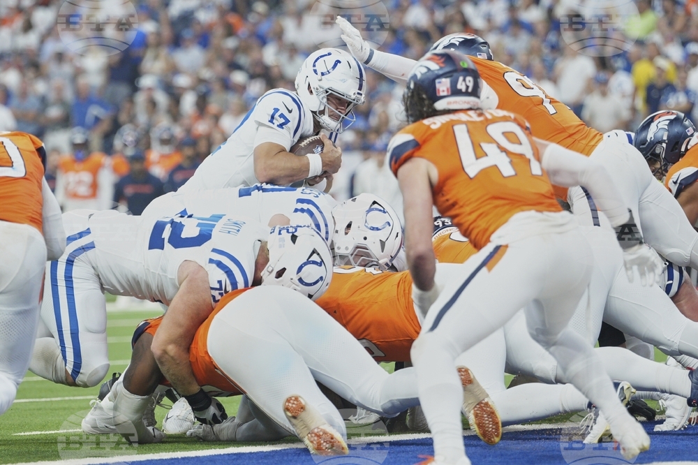 Indianapolis Colts quarterback Daniel Jones, middle, goes in for a touchdown during the first half an NFL football game against the Denver Broncos, Sunday, Sept. 14, 2025, in Indianapolis. (AP Photo/Michael Conroy)