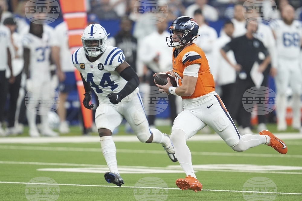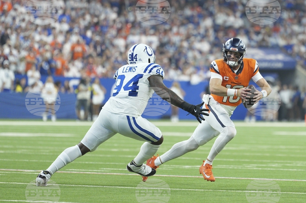 Denver Broncos quarterback Bo Nix (10) looks to throw against Indianapolis Colts defensive end Tyquan Lewis (94) during the first half an NFL football game, Sunday, Sept. 14, 2025, in Indianapolis. (AP Photo/AJ Mast)