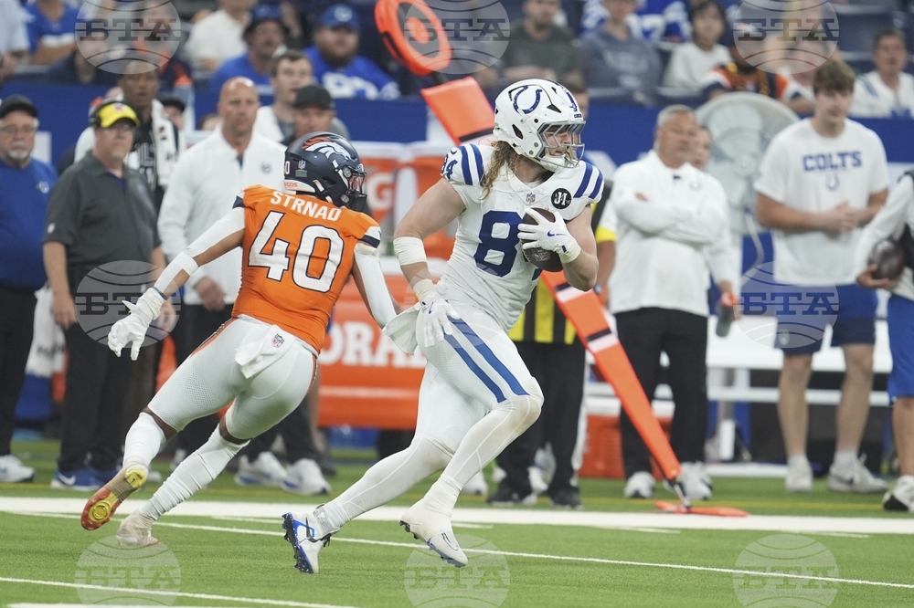 Indianapolis Colts tight end Tyler Warren (84) runs against Denver Broncos linebacker Justin Strnad (40) during the second half an NFL football game, Sunday, Sept. 14, 2025, in Indianapolis. (AP Photo/Michael Conroy)
