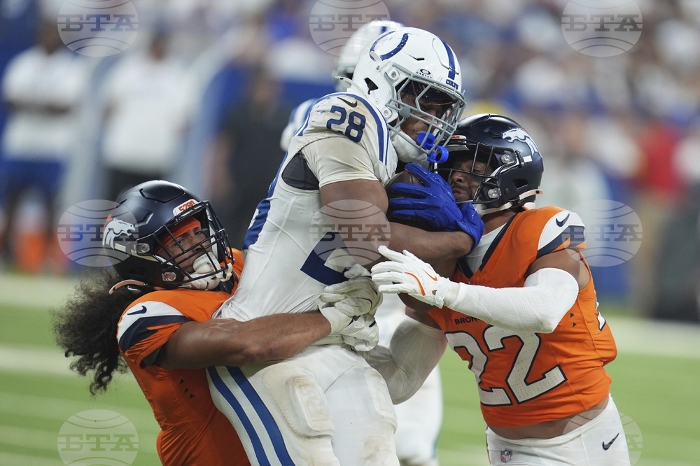 Indianapolis Colts running back Jonathan Taylor (28) is tackled by Denver Broncos safety Talanoa Hufanga, left, and Brandon Jones during the second half an NFL football game, Sunday, Sept. 14, 2025, in Indianapolis. (AP Photo/Michael Conroy)