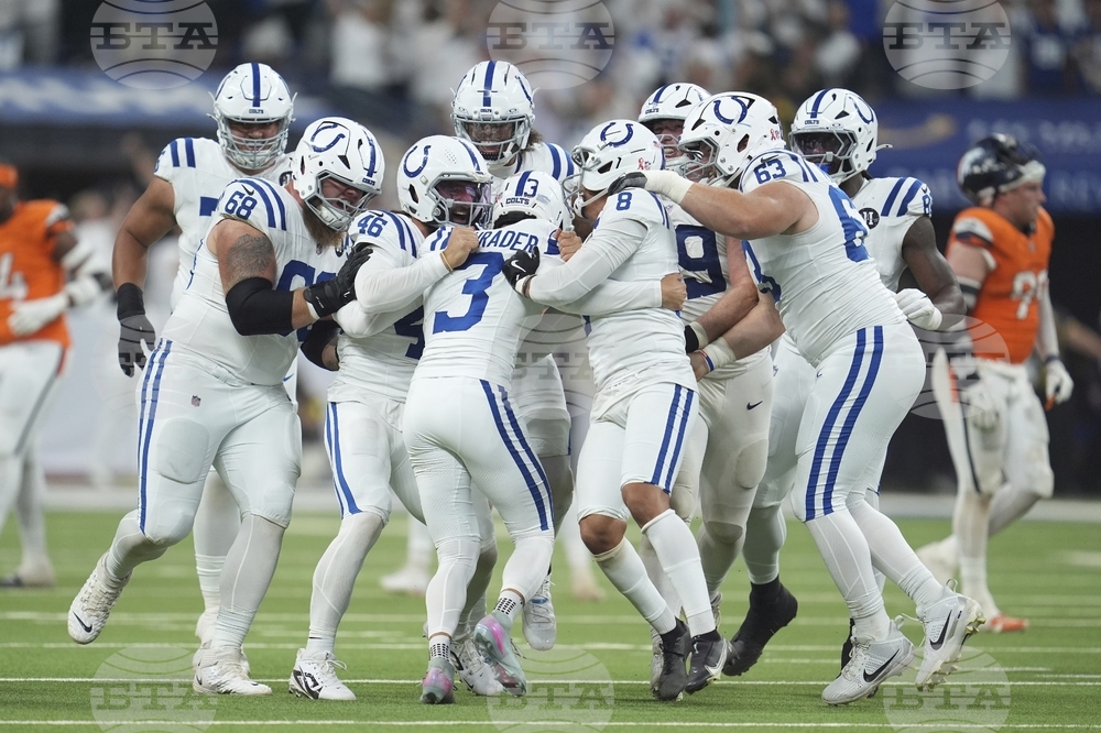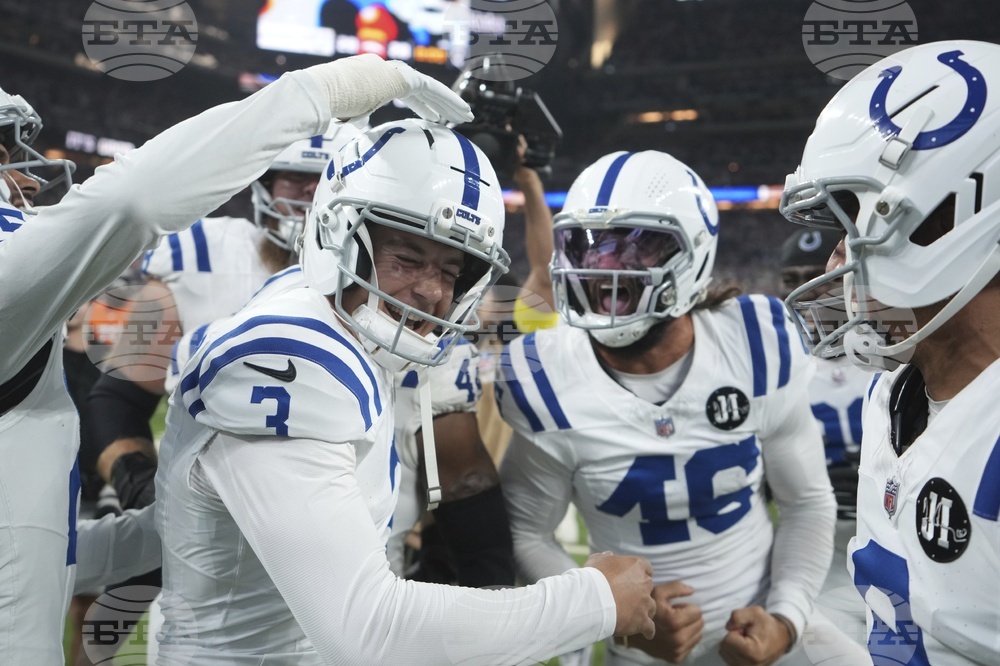 Indianapolis Colts place kicker Spencer Shrader (3) celebrates Sith Rigoberto Sanchez (8) and Cam Bynum (0) after Schrader kicked a game winning field goal during the second half an NFL football game against the Denver Broncos, Sunday, Sept. 14, 2025, in Indianapolis. (AP Photo/AJ Mast)