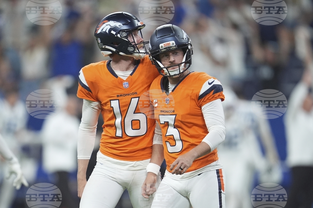 Denver Broncos place kicker Wil Lutz (3) walks off the field with Jeremy Crawshaw and Lutz missed a field goal during the second half an NFL football game against the Indianapolis Colts, Sunday, Sept. 14, 2025, in Indianapolis. (AP Photo/Michael Conroy)