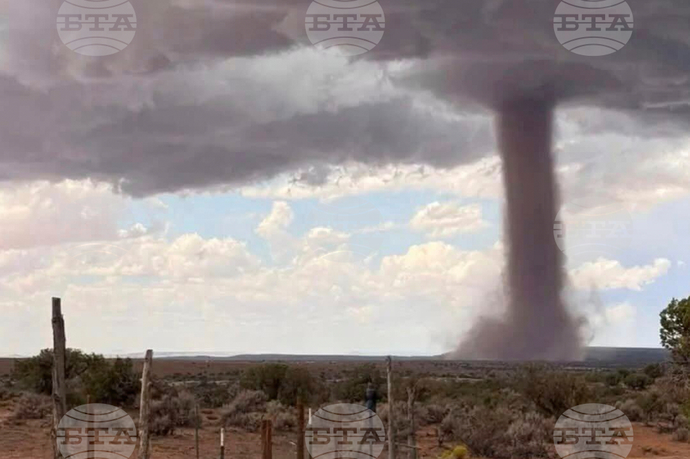In this photo released by the Navajo Police Department, a tornado funnel is seen Sat., Sept. 13, 2025, northeast of Montezuma Creek, Utah. (Navajo Police Department via AP)