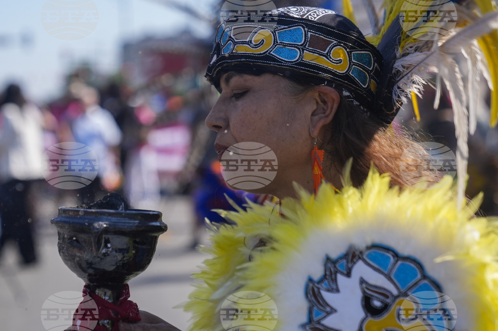 Diana Becerra wears an indigenous Mexican costume during the Mexican Independence Day Parade, Sunday, Sept. 14, 2025, in the Little Village neighborhood of Chicago. (AP Photo/Erin Hooley)