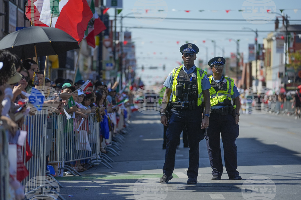 Police officers stand by as people watch the Mexican Independence Day Parade, Sunday, Sept. 14, 2025, in the Little Village neighborhood of Chicago. (AP Photo/Erin Hooley)