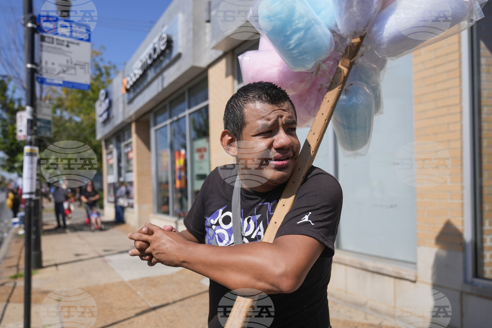 Armando Lopez sells cotton candy during the Mexican Independence Day Parade, Sunday, Sept. 14, 2025, in the Little Village neighborhood of Chicago. (AP Photo/Erin Hooley)