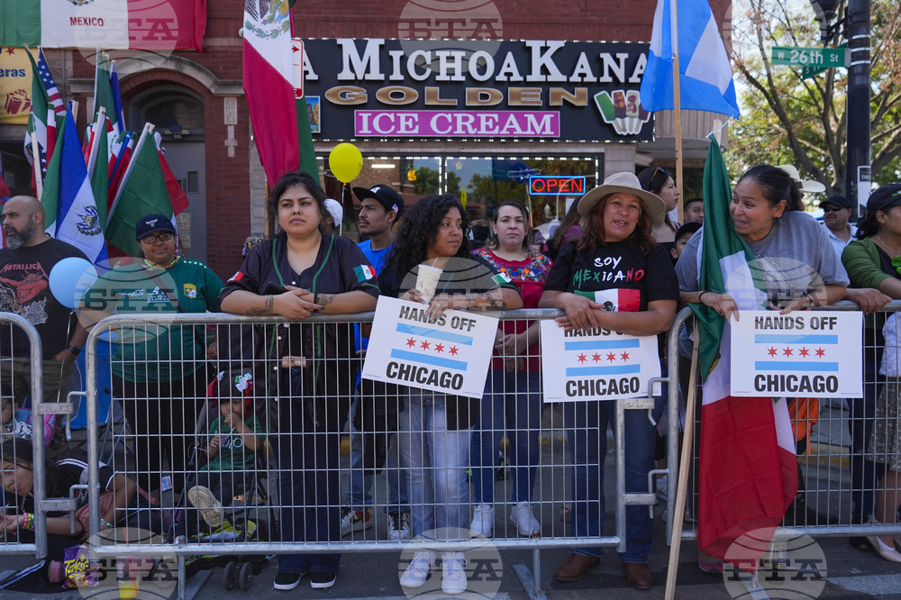 People hold "hands off Chicago" signs as they watch the Mexican Independence Day Parade, Sunday, Sept. 14, 2025, in the Little Village neighborhood of Chicago. (AP Photo/Erin Hooley)
