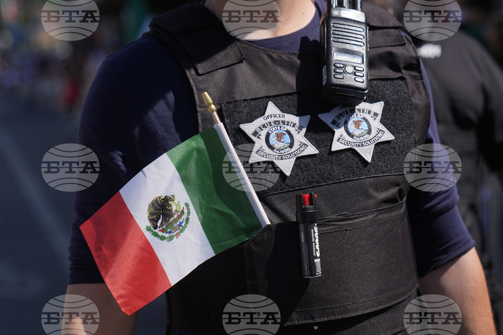 A security officer wears a Mexican flag during the Mexican Independence Day Parade, Sunday, Sept. 14, 2025, in the Little Village neighborhood of Chicago. (AP Photo/Erin Hooley)