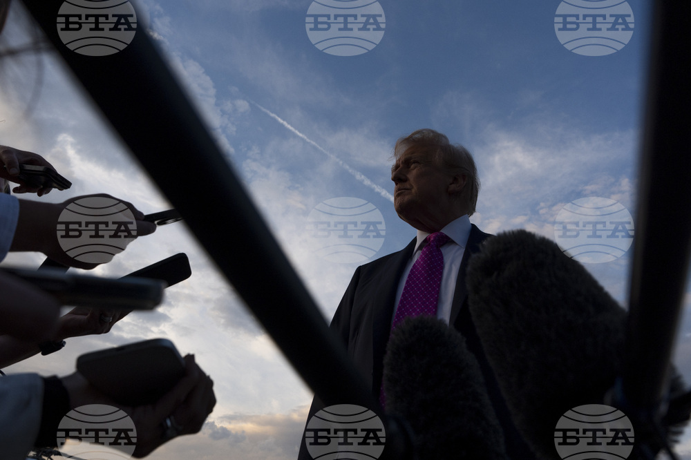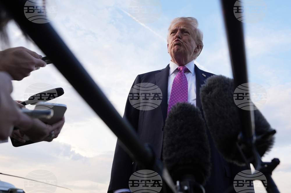 President Donald Trump speaks with reporters before he departs on Air Force One at Morristown Airport, Sunday, Sept. 14, 2025, in Morristown, N.J. (AP Photo/Alex Brandon)