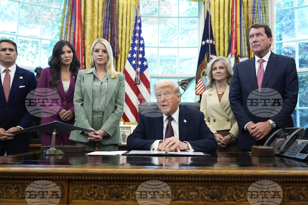 President Donald Trump speaks as Deputy Attorney General Todd Blanche, from left, Homeland Security Secretary Kristi Noem, Attorney General Pam Bondi, Sen. Marsha Blackburn, R-Tenn., Sen. Bill Hagerty, R-Tenn., and Tennessee Gov. Bill Lee listen, in the Oval Office of the White House, Monday, Sept. 15, 2025, in Washington. (AP Photo/Alex Brandon)