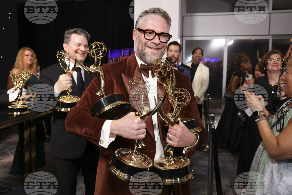 IMAGE DISTRIBUTED FOR THE TELEVISION ACADEMY – EXCLUSIVE - Seth Rogen picks up their official Emmy statuette at the 77th Emmy Awards Trophy Table on Sunday, Sept. 14, 2025 at the Peacock Theater in Los Angeles. (Photo by Mark Von Holden/Invision for the Television Academy/AP Content Services)