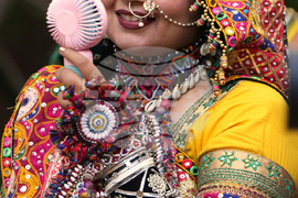 An Indian woman wearing traditional attire uses a battery operated fan as she practicea the Garba, a traditional dance of Gujarat state, during a rehearsal ahead of Navratri or nine night festival, in Ahmedabad, India, Monday, Sept. 15, 2025. (AP Photo/Ajit Solanki)