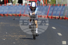 FILE - Matthew Riccitello, of the United States, competes in the first stage of the tour of Spain, La Vuelta, cycling race, an individual time trial with start in Lisbon and finish in Oeiras, Portugal, Saturday, Aug. 17, 2024. (AP Photo/Pedro Rocha, File)