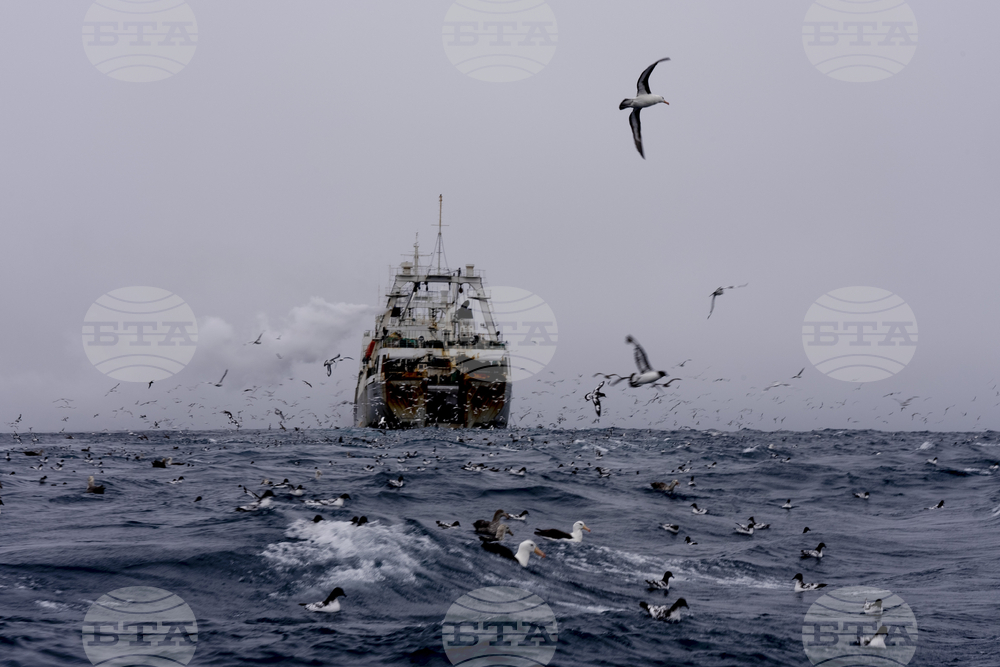 FILE - China's Long Fa fishing vessel is followed by flocks of seabirds in the Southern Ocean off the coast of the South Orkney Islands, north of the Antarctic Peninsula, on March 10, 2023. (AP Photo/David Keyton, File)