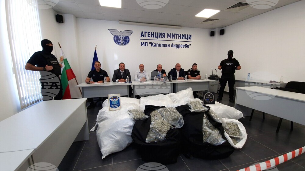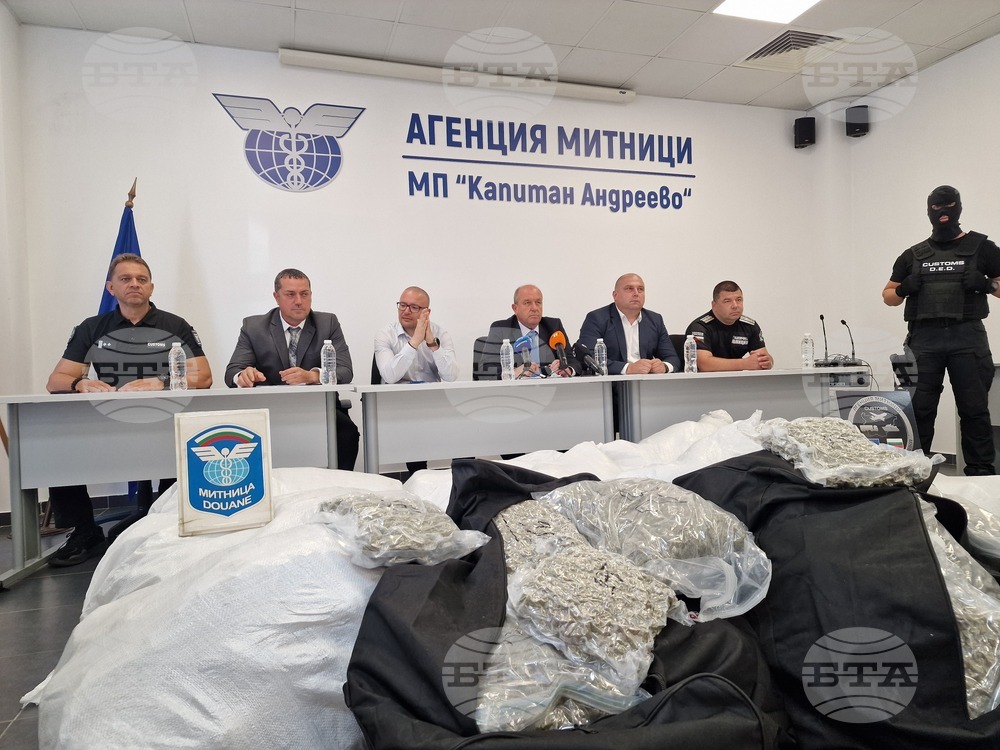 "Капитан Андреево" (15 септември 2025) На Граничен конролно-пропускателен пункт "Капитан Андреево" се провежда брифинг по повод задържана пратка с марихуана с общо тегло 739,180 кг за над 11,8 млн. лева, която е разкрита в камион с турска регистрация на граничния пункт. На снимката (от ляво надясно): началник на отдел "Борба с наркотрафика", дирекция "Митническо разузнаване и разследване" Стефан Бакалов, зам.-директорът на ТД "Митница" Бургас Иван Пасков, началникът на отдел "Борба с наркотрафика" Атанас Куртов, окръжният прокурор на Хасково Иван Стоянов, началникът на Митнически пункт "Капитан Андреево" Филип Николов и главният инспектор и началникът на ГКПП "Капитан Андреево" Яни Пейчев.