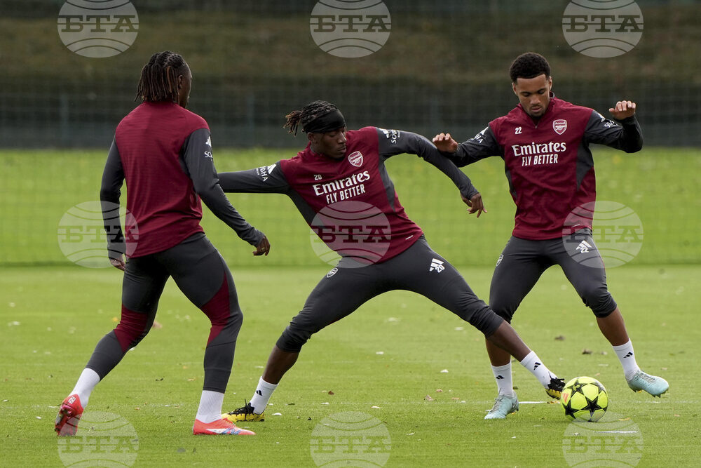 Arsenal's Eberechi Eze, left, Noni Madueke, centre, and Ethan Nwaneri during a training session at the Sobha Realty Training Centre, London, Monday Sept. 15, 2025. (Gareth Fuller/PA via AP)