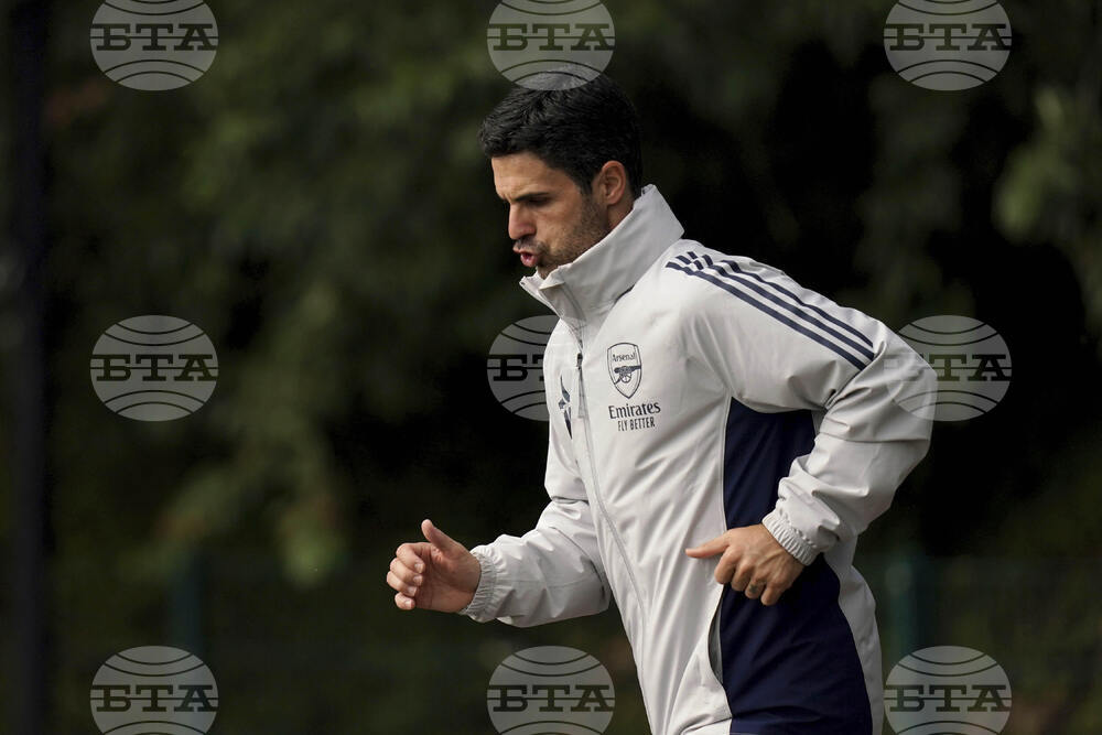 Arsenal manager Mikel Arteta during a training session at the Sobha Realty Training Centre, London, Monday Sept. 15, 2025. (Gareth Fuller/PA via AP)
