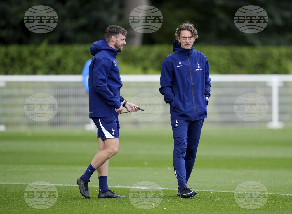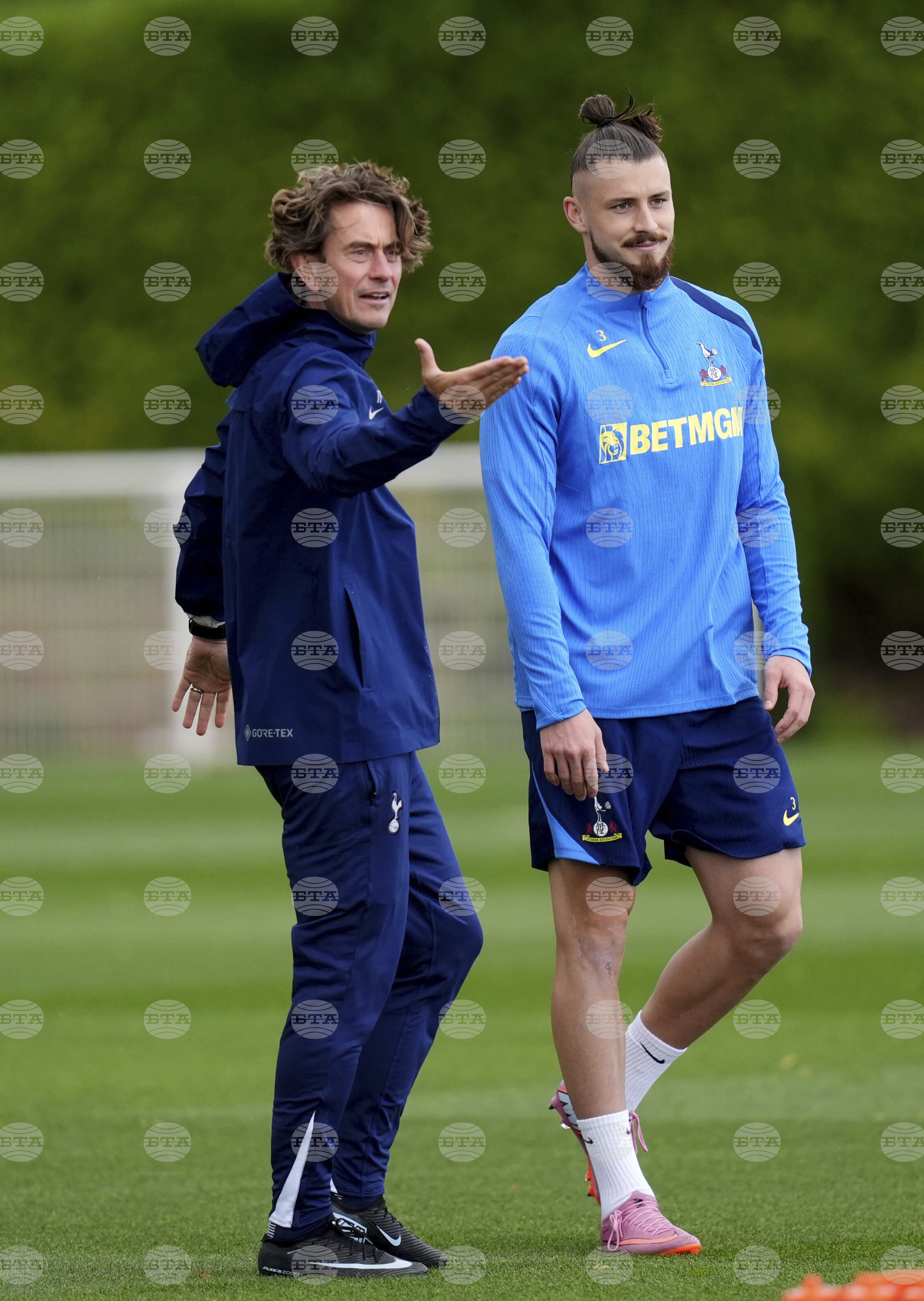 Tottenham Hotspur manager Thomas Frank, right, during a training session in London, England, Monday Sept. 15, 2025, ahead of the Champions League soccer match against Villarreal. (John Walton/PA via AP)